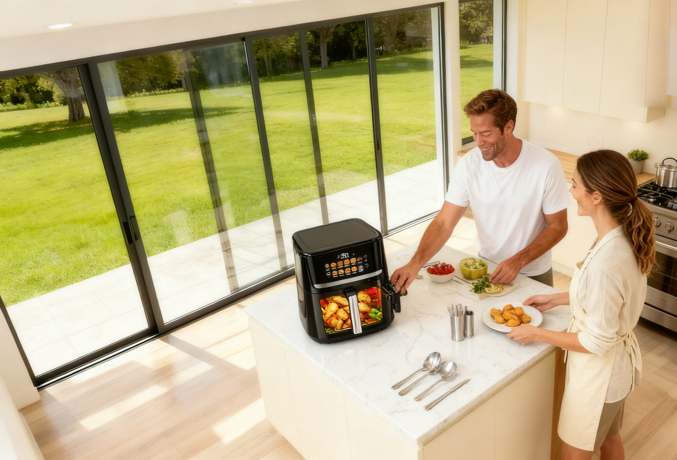 大卫与艾米是一对居住在伦敦的夫妻。汤姆是一名会计师,注重效率和精准;丽莎是一位平面设计师,追求生活品质和创意。他们住在现代化的房子里,二人热爱尝试各种美食,尤其是渴望能享受到酥脆可口的油炸食物,同时又对传统油炸带来的油腻、高热量和繁琐清洁过程望而却步。经过挑选,他们选择了我们的RCAF-1000ATC 智能空气炸锅。其时尚的黑色外观、直观的数字化触摸屏以及多功能(空气炸、烘焙、烧烤、再加热等)特性深深吸引了他们。特别是其1500W大功率和10升的大容量,足以轻松应对两人的餐食或招待朋友的需求。