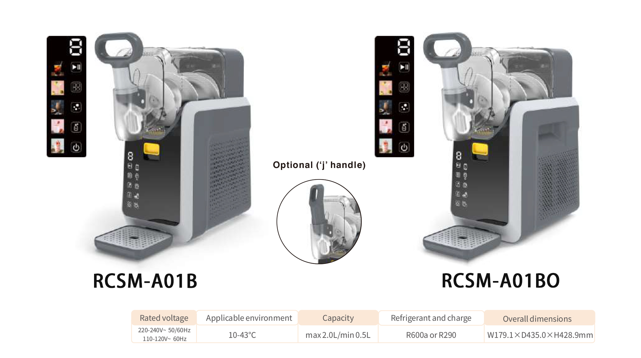 Rated voltage: 220-240V~50/60Hz 110-120V~60Hz Applicable environment: 10-43℃ Capacity: ma* 2.0L/min 0.5L (Soft Ice Cream ma* 1.5L) Refrigerant and charge: R600a or R290 Overall dimensions: W179.1*D435.0*H428.9mm