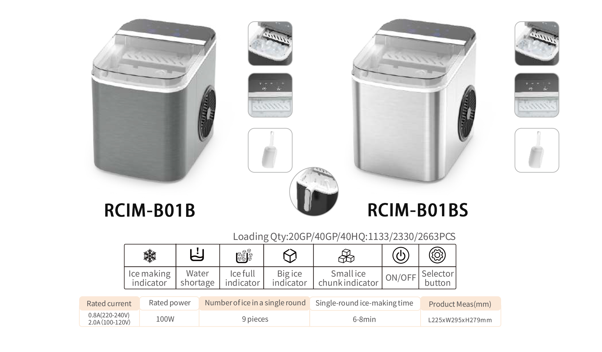 Rated current: 0.8A (220-240V) 2.0A(100-120V) Rated power: 100W Number of ice in a single round: 9 pieces Single-round ice-making time: 6-8min Product Meas(mm): L225*W295*H279mm